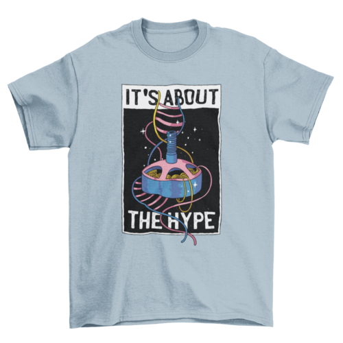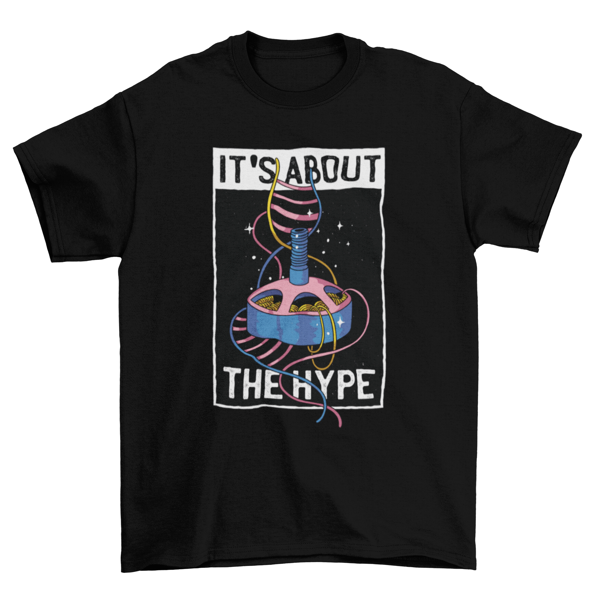 T-shirt design featuring a drone engine spliced with DNA and a quote saying IT'S ABOUT THE HYPE.